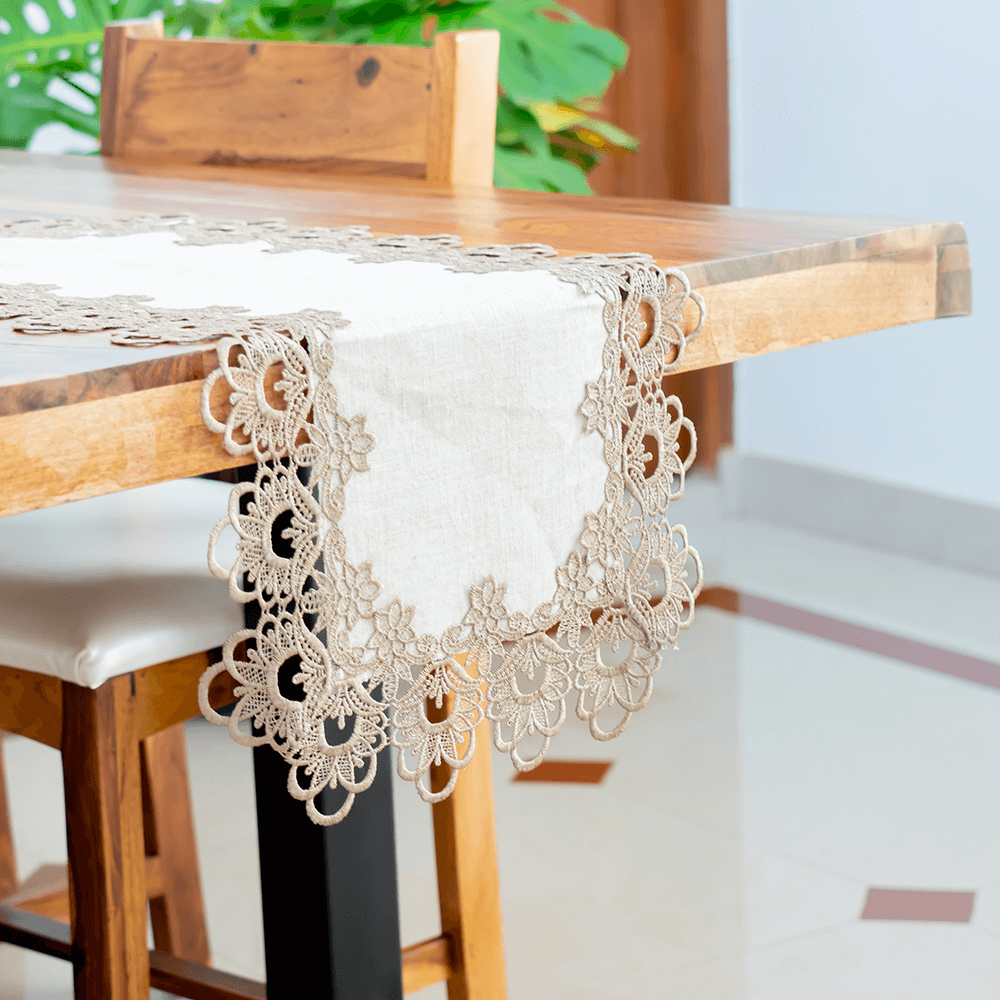 A refined table runner featuring intricate crochet artistry in soft beige tones—ideal for heritage-inspired or bohemian spaces.