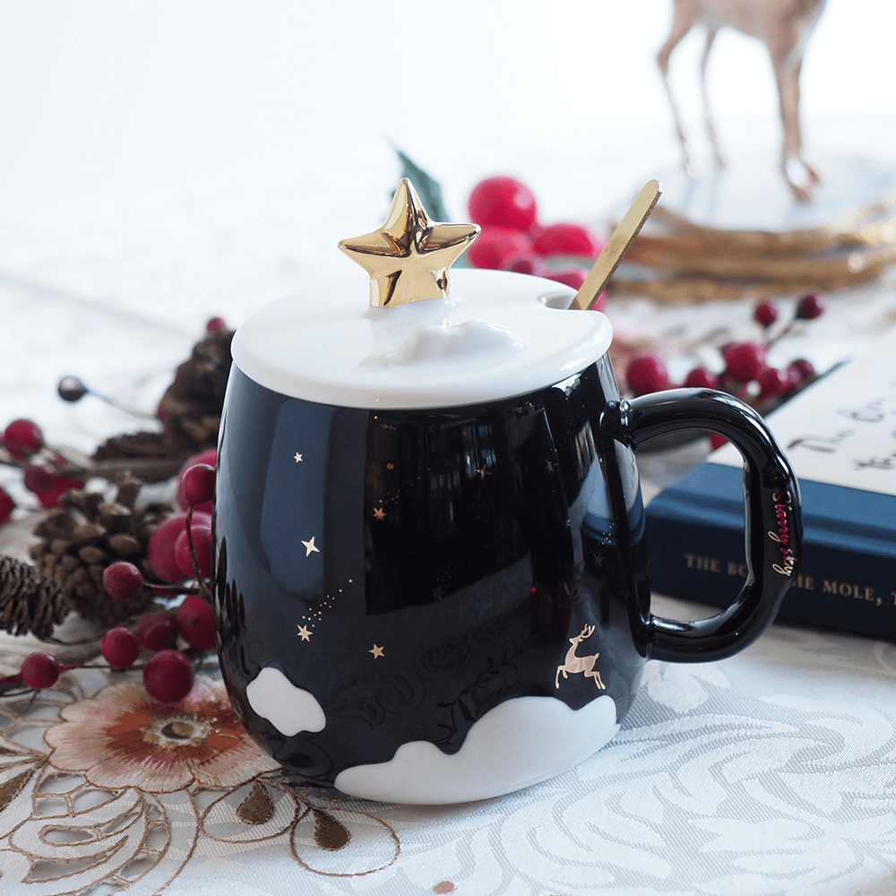 Elegant black mug with glossy finish and gold star-topped lid, blending modern flair with timeless charm.