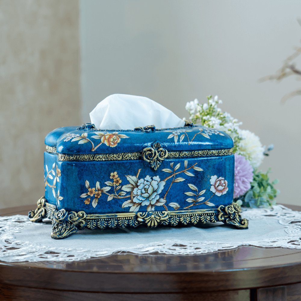 Blue floral patterned tissue holder