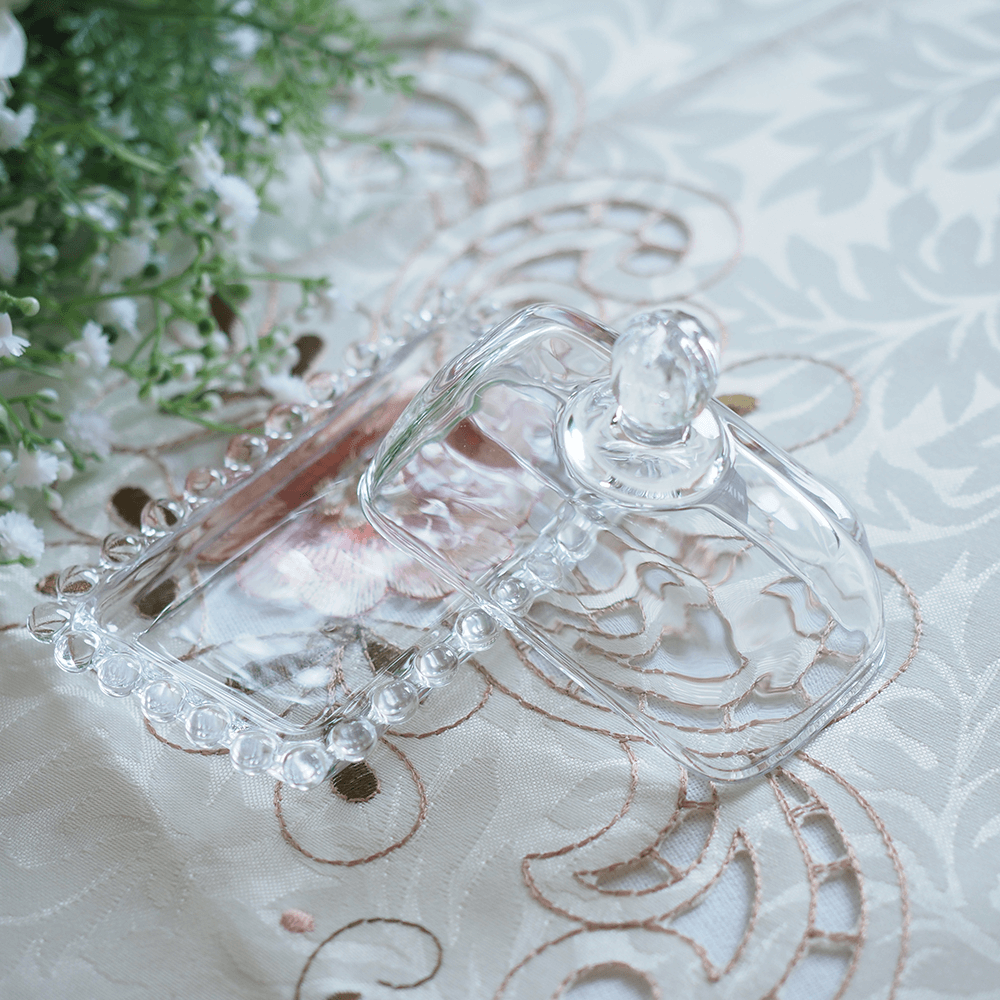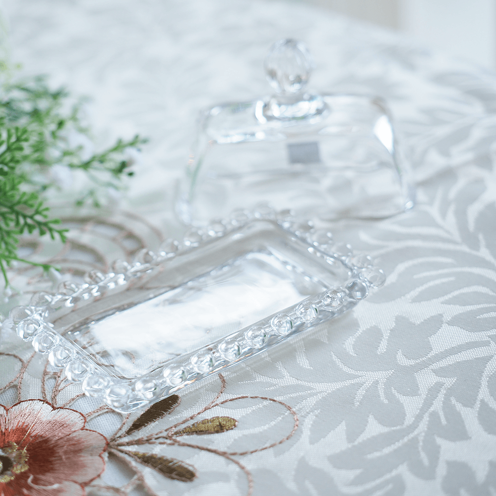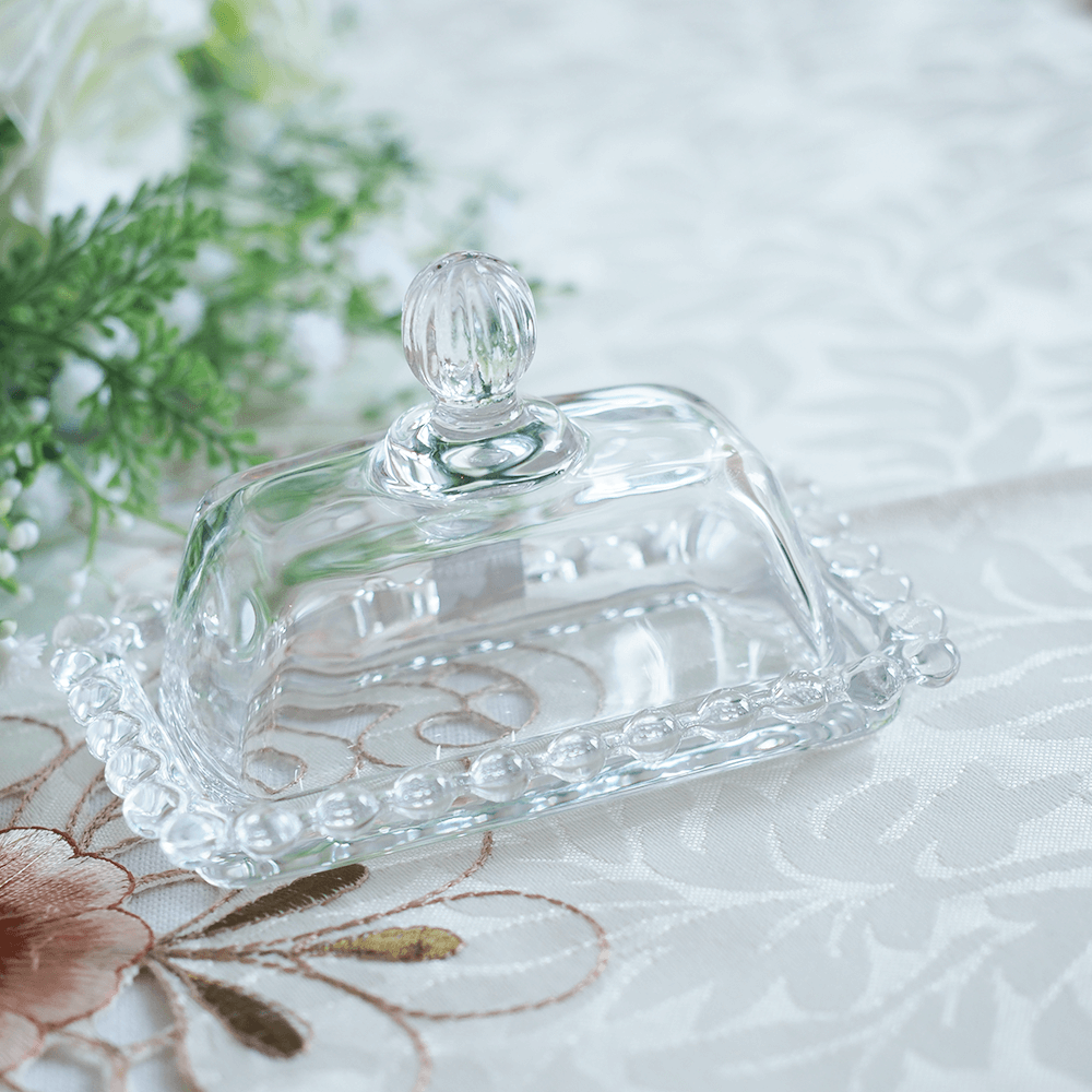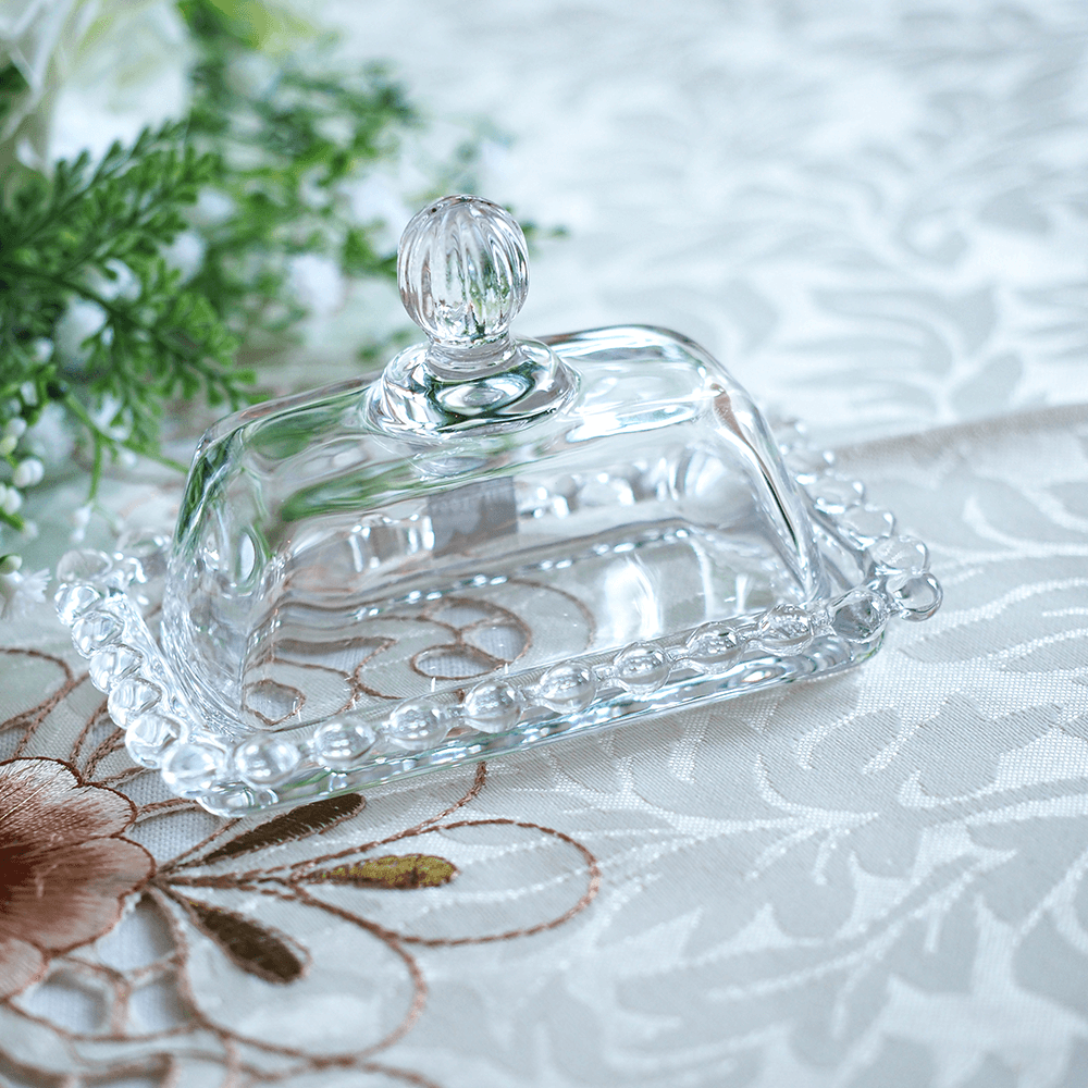 A sophisticated glass butter dish offering a clean, classic look for refined tablescapes.