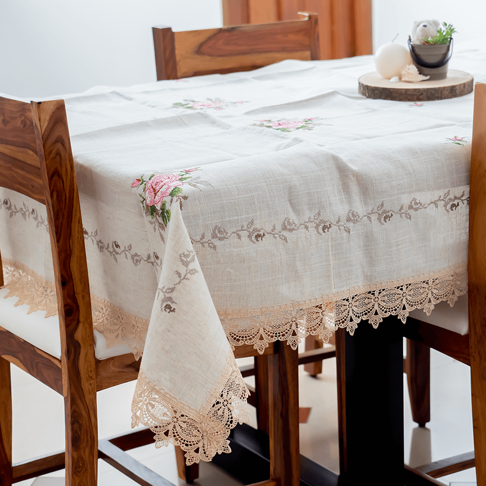 Ornate and sophisticated, this cream lace tablecloth pairs well with vintage dinnerware for elegant gatherings.