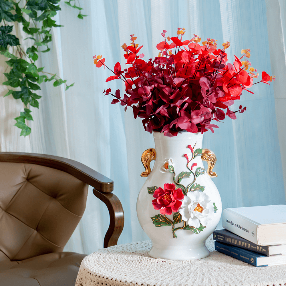 A striking contrast of color and texture, the Crimson Bloom Vase enlivens tabletops and spaces with its bold red blooms and sculptural form.