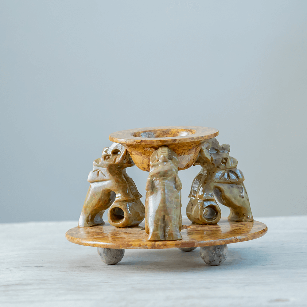 A beautifully sculpted oil burner crafted from natural soapstone, featuring intricate carvings. Ideal for diffusing essential oils and adding artisanal charm to serene interiors.
