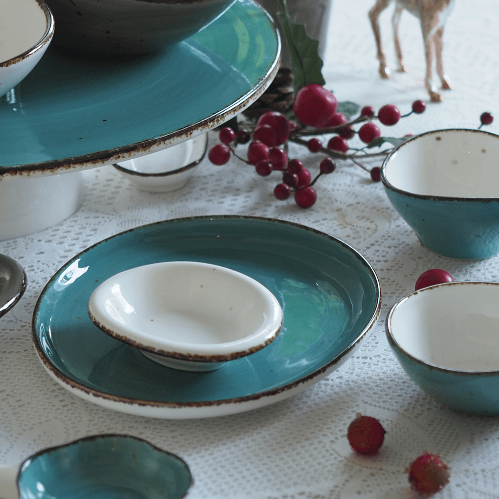 A modern take on traditional stoneware, featuring a turquoise rim and ivory center. Its smooth yet rustic glaze pairs beautifully with matching bowls and dishes.