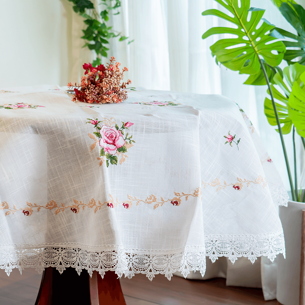Graceful white tablecloth adorned with pink floral detailing, bringing a romantic touch to interiors or gatherings.